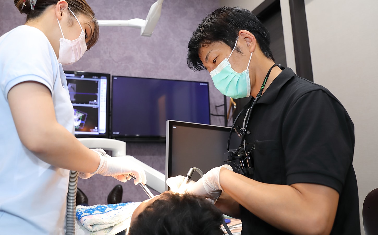 当院には幸い、多くの患者様が来院されます。年代層も子供からお年寄りまで幅広くいらっしゃいます。ですので、小児歯科治療から義歯、審美治療、インプラントまで、どれも偏りなく診ることが可能です。また、それぞれの症例を数多く経験できるので経験値が高まり、技術を向上させることが可能です。
